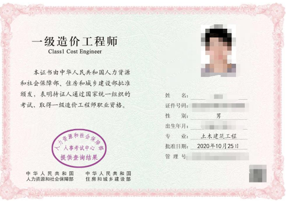 一级造价工程师证书样本