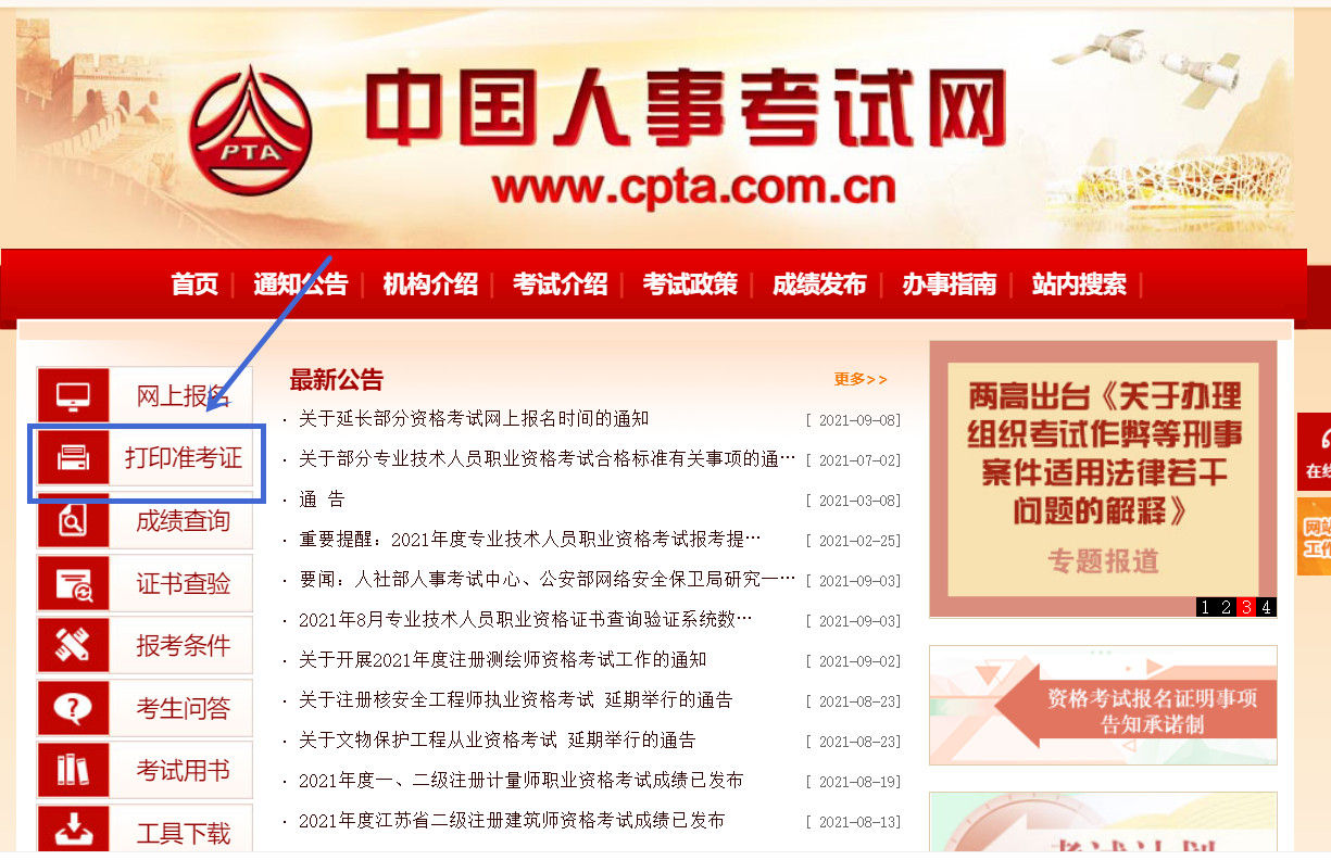 准考证打印流程:打开中国人事考试网,点击左侧的“打印准考证”进入。