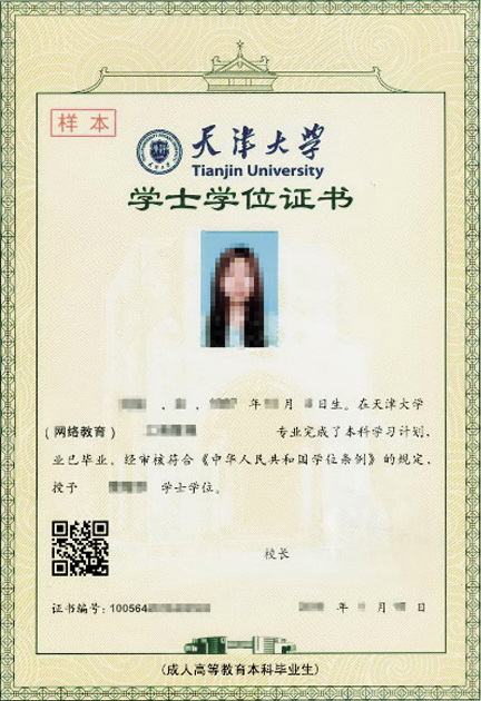 学生在学习期限内修满所修专业教学计划规定的全部学分、考试成绩合格,且须通过教育部规定的现代远程教育试点高校网络教育部分公共基础课全国统一考试,可获得国家承认的由教育部统一电子注册的天津大学毕业证书,注明网络教育,加盖“天津市成人高等教育证书专用章”,电子注册中办学类型代码为“7”。符合教育部、天津市及天津大学有关成人学位授予条件者,授予成人高等教育学士学位。