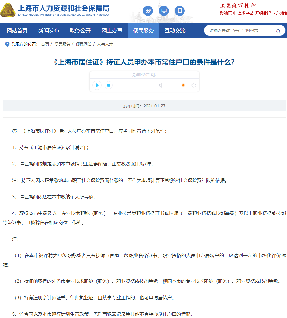 《上海市居住证》持证人员申办本市常住户口(简称居转户),应当同时符合下列条件: