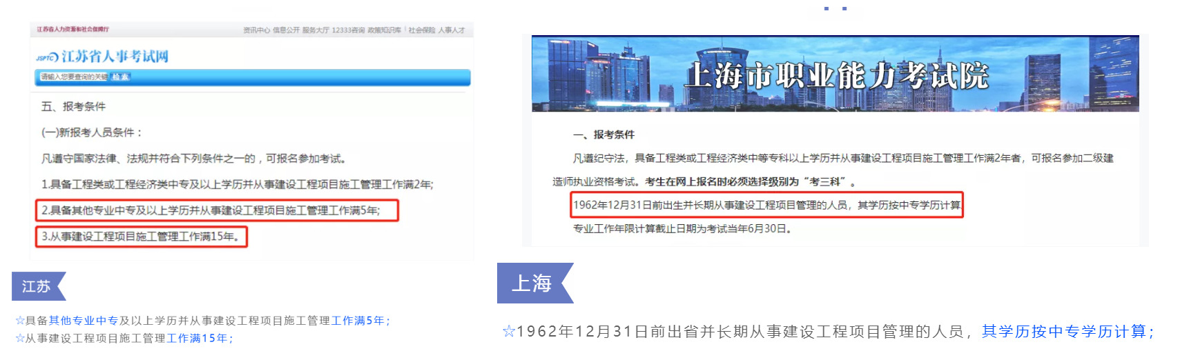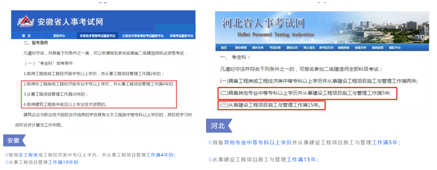 其中,重庆,安徽、江苏、河北、上海5个地区只要从事建设工程项目施工与管理工作满10-15年不等,就可以直接报考二级建造师。