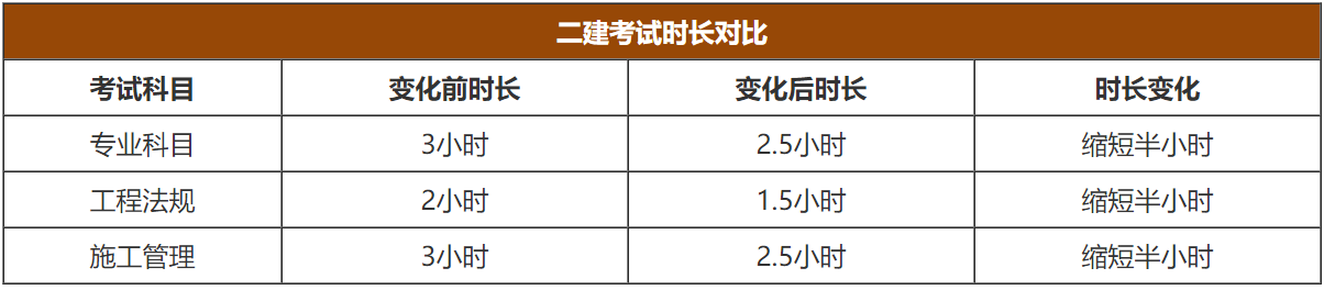 2.二建考试时长统一缩短半个小时,如下表: