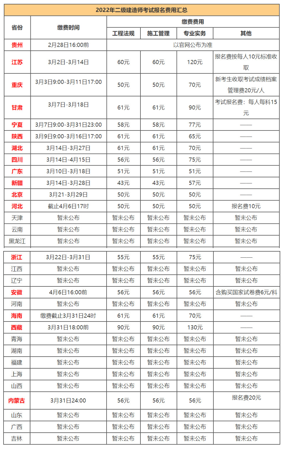 2022年二级建造师报名时间陆续公布中,各二级建造师考试报名费用略有差异,考生网上报名后,须在规定时间内完成网上缴费。未在规定时间内缴费的报考者,视为自动放弃考试。2022年二级建造师报名费用汇总,供考生们参考。