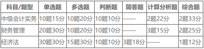 中级会计职称考试《中级会计实务》、《财务管理》和《经济法》三个科目考试题型如下: