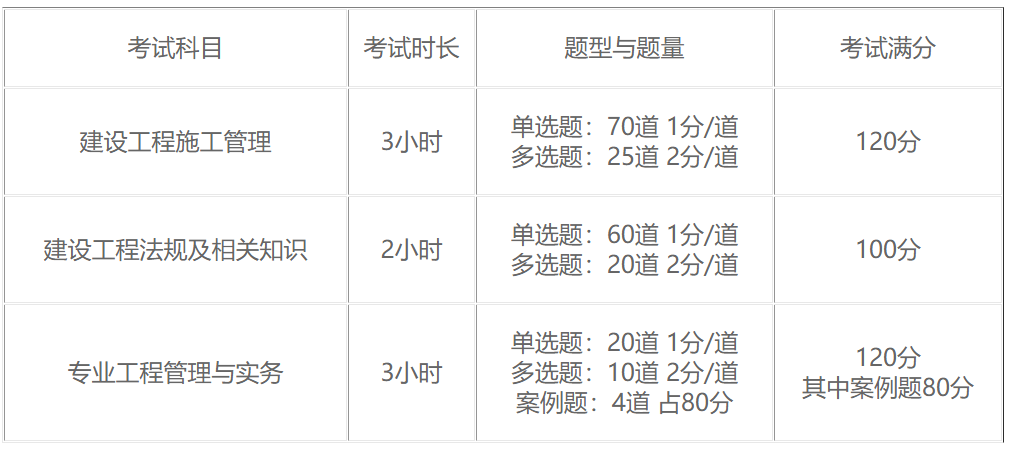 《专业工程管理与实务》:单选题:20道 1分/道;多选题:10道 2分/道;案例题:4道 占80分。